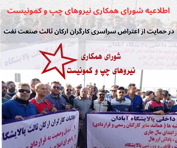 «شورای همکاری نیروهای چپ و کمونیست»، ضمن اعلام همبستگی کامل با کارگران ارکان ثالث و خانوادههای آنان، این حرکت را گامی مهم در جهت سازمانیابی آگاهانه و سراسری طبقهی کارگر ایران میداند. ما بر این باوریم که صدای کارگران نفت، صدای همه مزدبگیران کشور است؛ صدای همه کسانی است که خواهان پایان دادن به نظام پیمانکاری، تبعیض و استثمارند و راه رهایی را در اتحاد، تشکل و همبستگی طبقاتی کارگران میجویند.