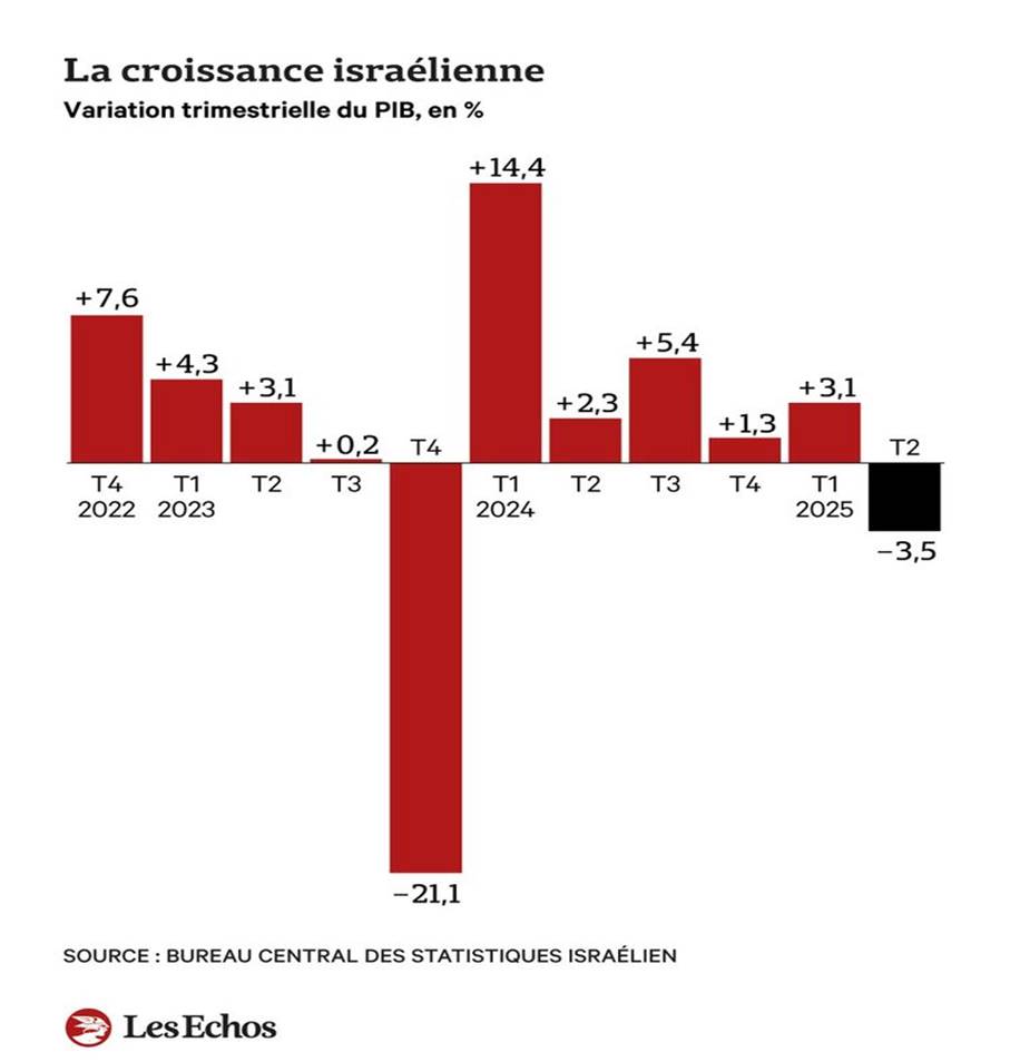 اسرائیل با جمعیت 10 میلیونی خویش، تا قبل از جنگ، اقتصاد شکوفایی داشت ولی بویژه و رویهمرفته پس از پایان جنگ 12 روزه بحران در اغلب محدوده ها افزایش قابل توجه ای می یابد. مطابق با نوشته ی روزنامه ی اقتصادی فرانسه بنام Les Echos که هر روزه منتشر می شود، عنوان شده است: «جنگ 12 روز علیه ایران در ماه ژوئن، نتایج گرانی را برای اسرائیل ببار می آورد. زیرا شلیک هزاران “موشک بالستیک و پهپادها از طرف جمهوری اسلامی، اقتصاد دولت یهودی را فلج می کند و موجب آن می شود که صدها ساختمان بطور کامل تخریب شوند… فعالیت بخش بزرگی از شرکت های تجاری قطع شده و صادرات مختل می گردد.»(2).