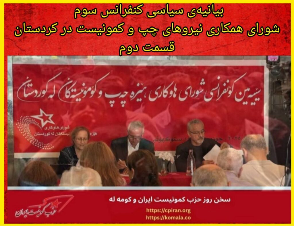 کنفرانس سوم شورای همکاری نیروهای چپ و کمونیست در کردستان که در روزهای ۷ و ۸ تیر ۱۴۰۴ برابر با ۲۸ و ۲۹ ژوئن ٢٠٢٥ در شهر استکهلم برگزار شد، علاوه بر بررسی گزارش فعالیت های شورا در فاصله دو کنفرانس و انجام وظایف دیگری که بر عهده اشت، کلیات بیانیه سیاسی ارائه شده به کنفرانس از جانب هیئت هماهنگی را تصویب و تکمیل و تدقیق آن بر أساس مباحث کنفرانس را به هیئت هماهنگی خود واگذار کرد. آنچه در اینجا به سمع و نظر بینندگان عزیز می رسد، قسمت دوم این بیانیه است که از جانب هيئت هماهنگی شورای همکاری تهیه و انتشار یافته است.
