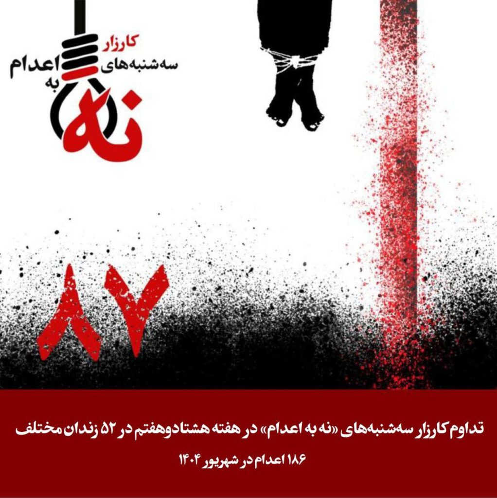 هفته هشتاد و هفتم کارزار سهشنبههای «نه به اعدام»، در حالی برگزار میشود که سایهی وحشت و سرکوب بیش از پیش بر جان مردم ایران سنگینی میکند. در ماههای اخیر، شاهد افزایش بیسابقهی شمار اعدامها هستیم؛ از ۲۵ شهریور تا کنون، دستکم ۴۶ اعدام از جمله ۲ زن و شش هموطن بلوچ، و در شهریورماه ۱۸۶ اعدام شامل ۷ زن گزارش شده است.