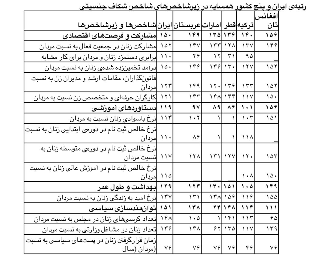 رتبهی ایران و پنج کشور همسایه در زیرشاخصهای شاخص شکاف جنسیتی