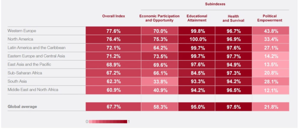 شکافهای بهداشتی و آموزشی بین زنان و مردان در میان صدوچهلوشش کشور فاصلهی نزدیکی با هم دارند و به ترتیب با نودوشش و نودوچهاردرصد برابری بین جنسیتها رخ دادهاند؛ اما در بخشهای مشارکت اقتصادی و tتوانمندسازی سیاسی شکاف بین مردان و زنان بسیار بیشتر است. در جدول زیر نقاطی که با رنگهای روشنتر نشان داده شدهاند، نمایانگر بخشهای نابرابرتر و رنگهای تیره بیانگر بخشهای برابرترند.