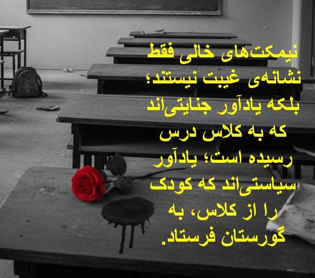 کلاسها دیگر مثل قبل نیستند. نیمکتهای خالی فقط نشانهی غیبت نیستند؛ بلکه یادآور جنایتیاند که به کلاس درس رسیده است؛ یادآور سیاستیاند که کودک را از کلاس، به گورستان فرستاد. کلاسهایی که دانشآموزانشان نام دوستان کشتهشدهشان را میدانند و معلمانی که دیگر فقط درس نمیدهند، بلکه شاهد و همراه این دادخواهیاند.