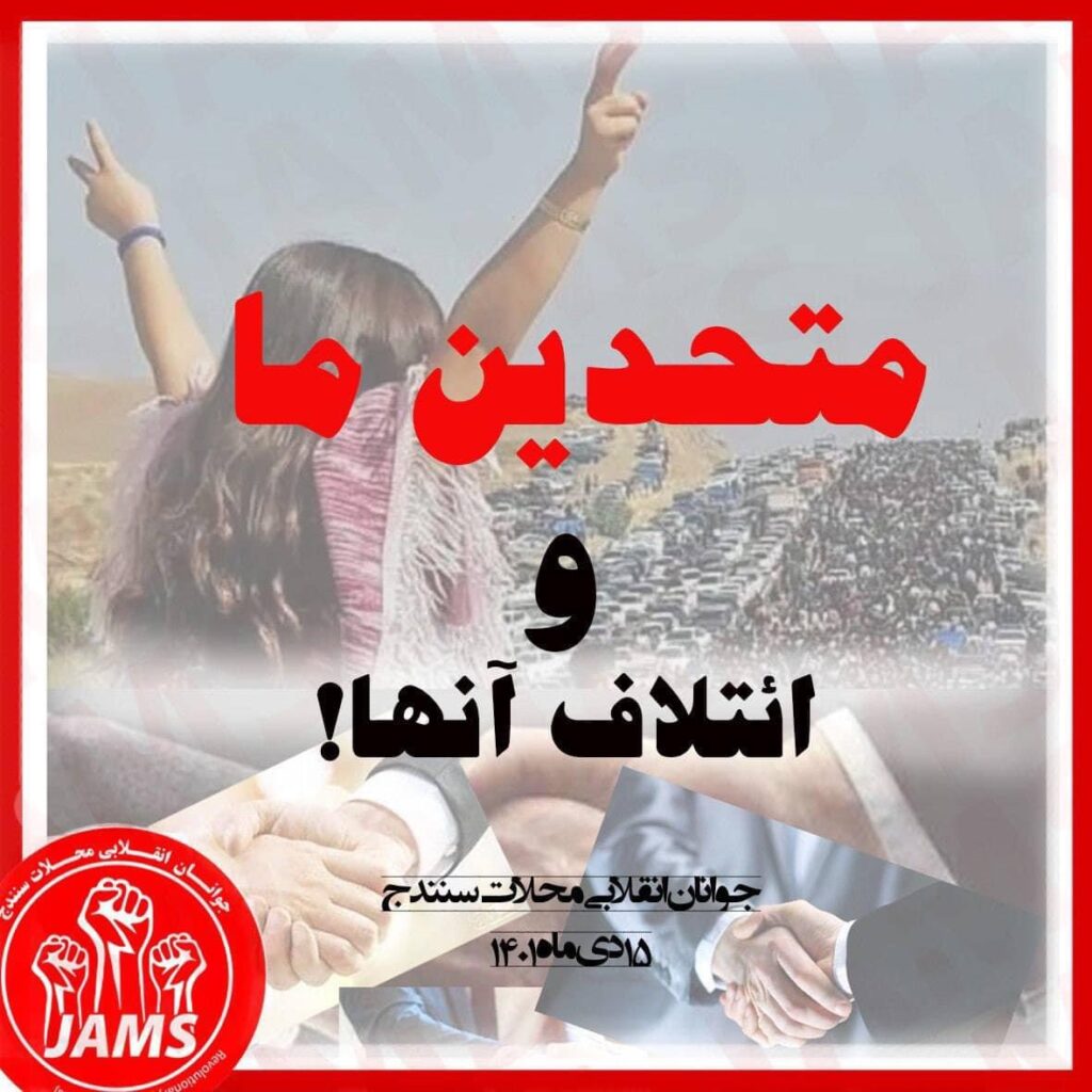 آنها بروند برای خود ائتلاف درست کنند و متحدین خود را بیابند و همه با همی را تبلیغ کنند، همانطور که پروژه های ققنوس، شورای گذار و فرشگرد و غیره تشکیل دادند و به شکست انجامید، آنها بروند در رویا هایشان و رسانه های خود و در شبکه های مجازی ائتلاف کنند. ما نیز متحدین خودمان را در دنیای واقع و از درون خودمان و هم طبقه ای ها و هم رنجان خودمان انتخاب می کنیم، ما در زمین سفت و در عالم واقعیت برای اهداف خود مبارزه می کنیم. ما متحدانه این اوضاع را به نفع خود تغییر داده و عدالت اجتماعی را اجرا می کنیم و دنیایی عاری از ظلم، جنایت، بی عدالتی، فقر و فساد، خشونت و تبعیض و آپارتاید جنسیتی، دنیایی آزاد و انسانی را با قدرت خود بنیاد خواهیم نهاد وبرای این هدف بزرگ و برای ایجاد چنین جامعه ای خود را سازمان میدهیم.