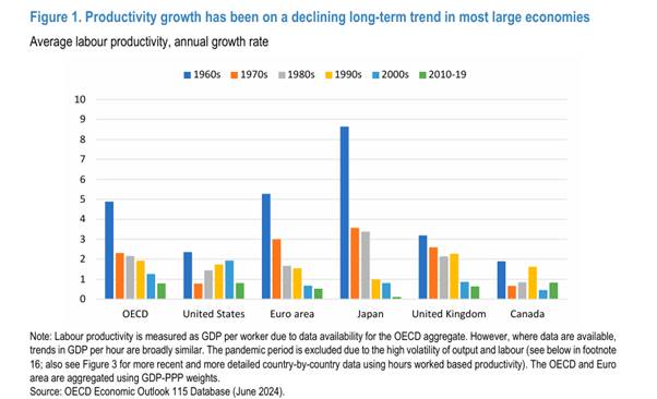 رشد بهرهوری نیروی کار از دهه ۱۹۷۰ در سراسر کشورهای عضو سازمان همکاری و توسعه اقتصادی (OECD) روند نزولی داشته و از آغاز قرن بیستم نیز ضعیفتر شده است. در ایالات متحده، بهرهوری از اواسط دهه ۱۹۹۰ تا اواسط دهه ۲۰۰۰ به دلیل افزایش بهرهوری در تولید تجهیزات فناوری اطلاعات و ارتباطات (ICT) و انتشار نوآوریهای مرتبط با اینترنت که در بخشهای استفادهکننده از فناوری اطلاعات و ارتباطات، بهویژه خردهفروشی، به کار گرفته شدند، افزایش یافت. «با این حال، این بازگشت نسبتاً کوتاهمدت بود و رشد بهرهوری از آن زمان تاکنون کمفروغ بوده است.»