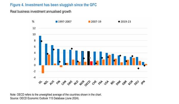 عامل کلیدی در افزایش بهرهوری نیروی کار، سرمایهگذاری در فناوریهای جدید صرفهجویی در نیروی کار است. اما سرمایهگذاری تجاری در همه کشورها به طور قابل توجهی کاهش یافته است. و سازمان همکاری و توسعه اقتصادی دلیل آن را روشن میکند. «کاهش سرمایهگذاری با وجود اعتبار ارزان و در دسترس برای شرکتهایی که به بازارهای سرمایه دسترسی دارند، با الگوهای تاریخی مطابقت دارد که نشان میدهد عدم قطعیت و سود مورد انتظار، نقش بیشتری نسبت به شرایط مالی در تصمیمات سرمایهگذاری ایفا میکنند. » به عبارت دیگر، سودآوری سرمایه کاهش یافته و انگیزه سرمایهگذاری در فناوریهای جدید را کاهش داده است.