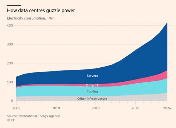 در همین حال، ساخت و ساز عظیم مراکز داده، سطح بیسابقهای از انرژی را مصرف میکند. آژانس بینالمللی انرژی پیشبینی میکند که مصرف برق مراکز داده تا سال ۲۰۳۰ دو برابر شده و به ۹۴۵ تراوات ساعت خواهد رسید – که بیشتر از برق فعلی مورد استفاده کل کشوری مانند ژاپن است. ایرلند و هلند به دلیل نگرانی در مورد تأثیر آنها بر شبکه برق، توسعه مراکز داده جدید را محدود کردهاند. در آموزش مدلهای هوش مصنوعی، افزایش شدید تقاضای برق در مراکز داده وجود دارد، همراه با عرضه انرژی تجدیدپذیر پرنوسان که تابآوری و ظرفیت سیستمهای انرژی فعلی را تهدید میکند.