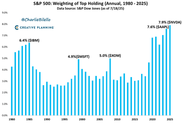 سهام Magnificent 7 – انویدیا، مایکروسافت، آلفابت (گوگل)، اپل، متا، تسلا و آمازون – اکنون حدود ۳۵٪ از ارزش بازار سهام ایالات متحده را تشکیل میدهند و ارزش بازار انویدیا حدود ۱۹٪ از Magnificent 7 را تشکیل میدهد. شاخص S&P 500 هرگز به اندازه امروز در یک سهام واحد متمرکز نبوده است، و انویدیا نزدیک به ۸٪ از این شاخص را تشکیل میدهد.
